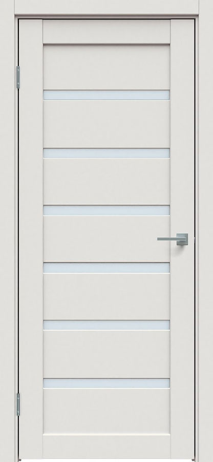 Отделка двери: царговая панель, покрытие Экошпон, стеклянные матовые вставки Satinato, цвет Сатин белый.