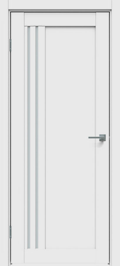 Отделка двери: царговая панель, покрытие Экошпон, стеклянные матовые вставки Satinato, цвет Сатин белый.