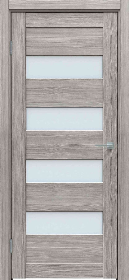Отделка двери: царговая панель, покрытие Экошпон, стеклянные матовые вставки Satinato, цвет Лиственница серая.