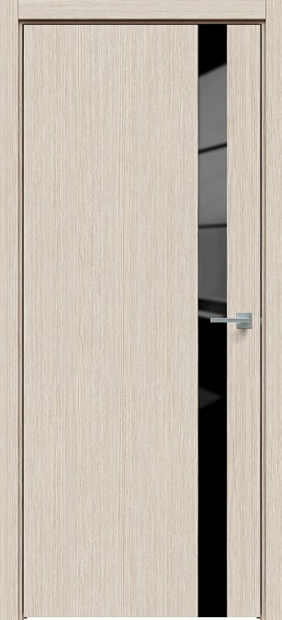 Отделка двери: царговая панель, покрытие Экошпон, стеклянная черная вставка, цвет Лиственница кремовая.