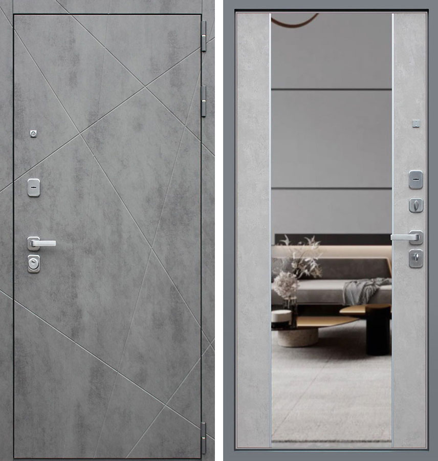 Дуэт-Б с зеркалом - качественная, надежная входная дверь производства компании "АСД". Внешняя отделка двери Дуэт-Б с зеркалом - экошпонированная панель МДФ толщиной 10 мм, объемная фрезеровка, цвет Бетон темный, внутренняя - экошпонированная панель МДФ толщиной 16 мм, большое зеркало, вставки из вертикальных молдингов по краям зеркала, цвет вставок Матовый хром, цвет отделки Бетон светлый.