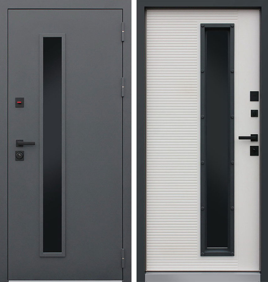 Наружная отделка: металл, два слоя покрытия, первый слой - цинкогрунт, второй слой - порошковое покрытие, тонированный двухкамерный стеклопакет, цвет Муар серый.